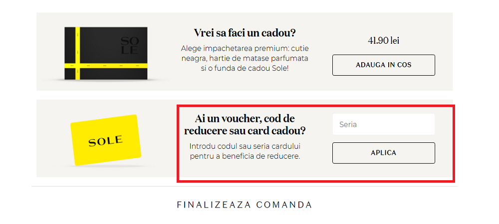Alegeți articolele pe care doriți să le cumpărați și adăugați-le în coș. Lipiți codul de voucher în chenarul special amenajat. Apăsați pe butonul ”APLICA”.