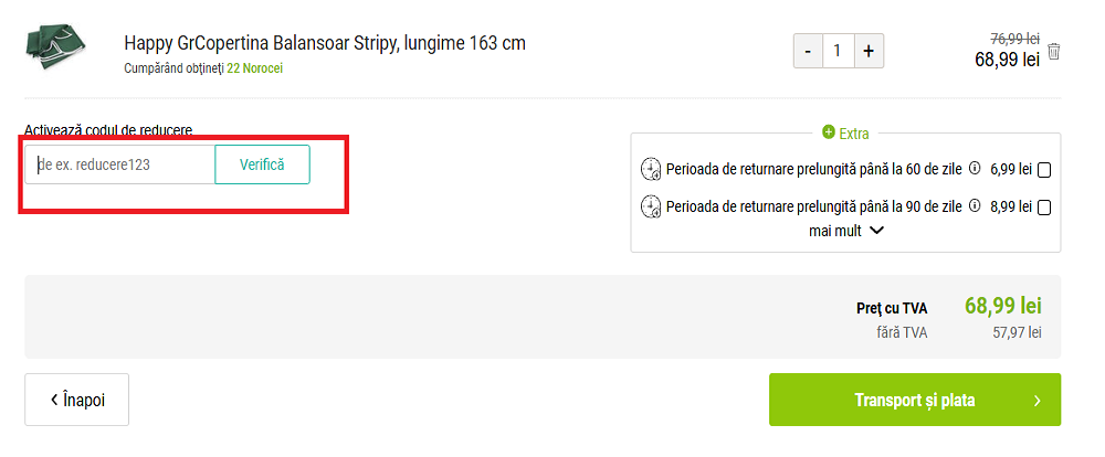 Alegeți articolele pe care doriți să le cumpărați și adăugați-le în coș. Lipiți codul de voucher în chenarul special amenajat. Apăsați pe butonul ”Verifică”.
