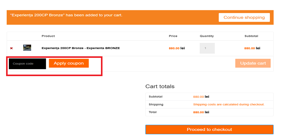Alegeți articolele pe care doriți să le cumpărați și adăugați-le în coș. Lipiți codul de voucher în chenarul special amenajat. Apăsați pe butonul ”Apply coupon”.