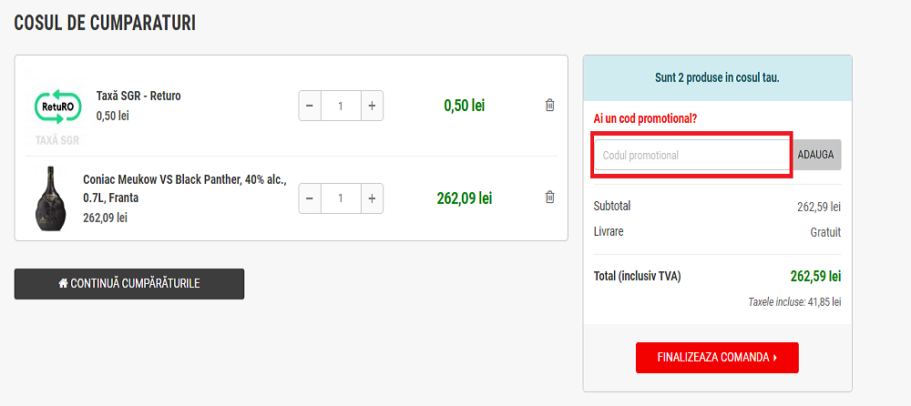 Alegeți articolele pe care doriți să le cumpărați și adăugați-le în coș. Lipiți codul de voucher în chenarul special amenajat. Apăsați pe butonul ”ADAUGA”.