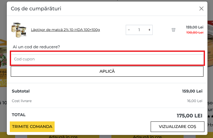 Cuponul se aplică direct în coșul de cumpărături pentru a primi instant reducerea la produsele selectate.