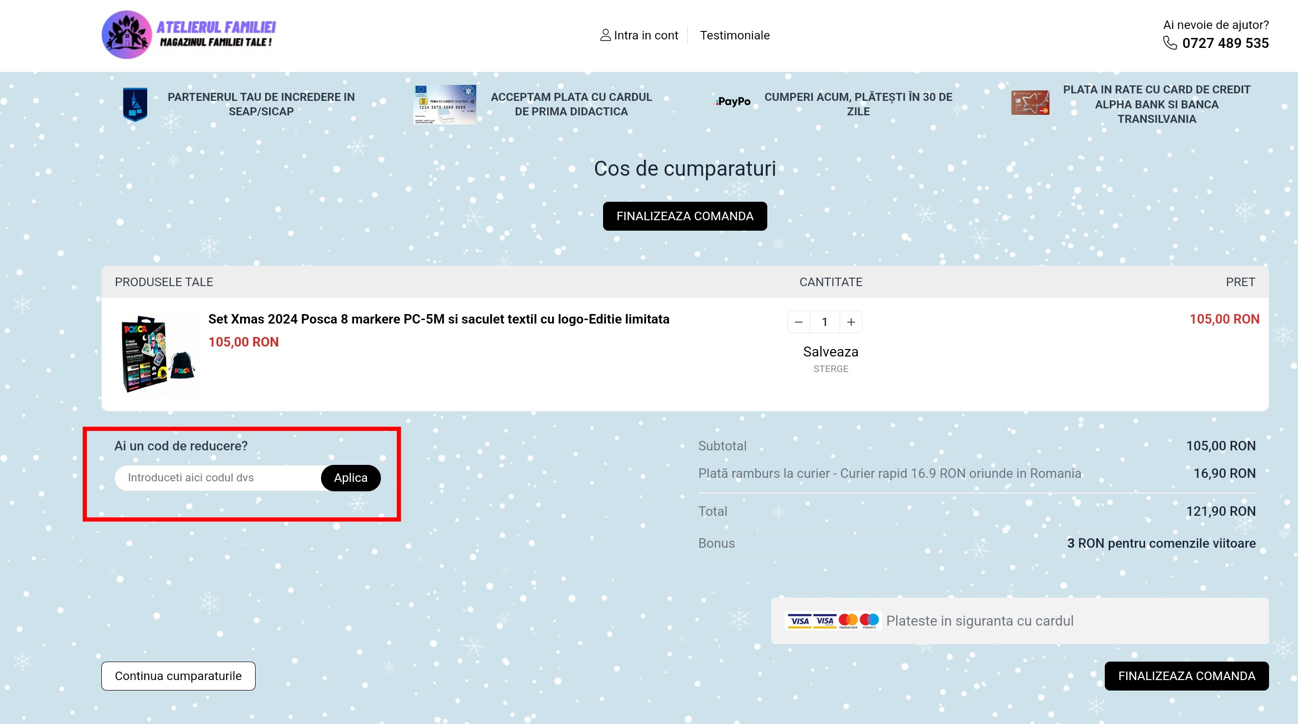 Cuponul de reducere îl puteți folosi în coșul magazinului. Valoarea minimă a comenzii 149 lei.