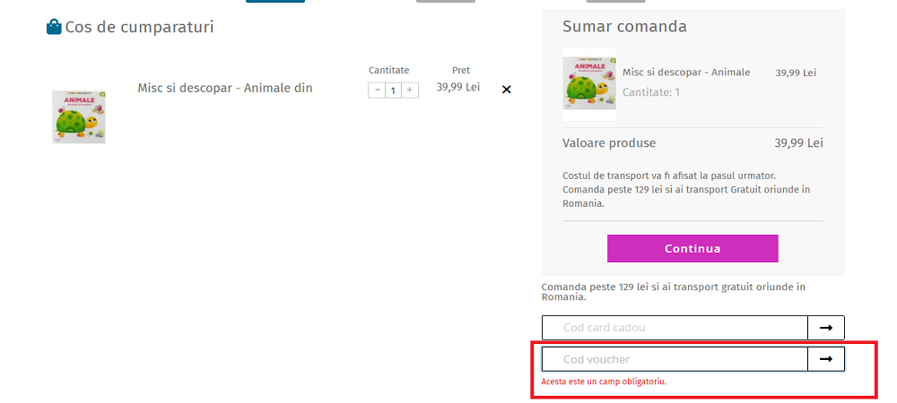 Alegeți articolele pe care doriți să le cumpărați și adăugați-le în coș. Lipiți codul de voucher în chenarul special amenajat. Apăsați pe butonul în formă de săgeată.