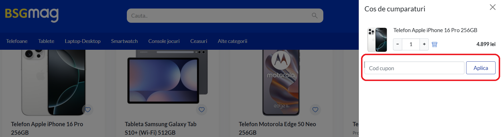 Cuponul se aplică direct în coșul de cumpărături pentru a primi instant reducerea la produsele selectate.