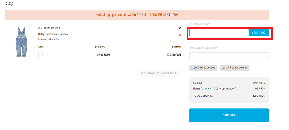 În pagina de finalizare a comenzii, găsiți câmpul dedicat pentru cuponul de reducere și introduceți codul corespunzător. Apăsați pe butonul ”APLICĂ COD”.