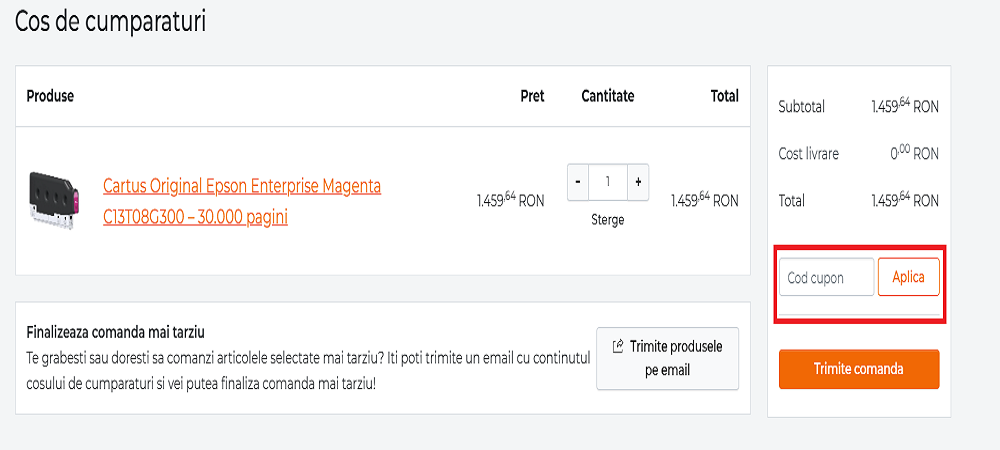 Cuponul se aplică direct în coșul de cumpărături pentru a primi instant reducerea la produsele selectate.