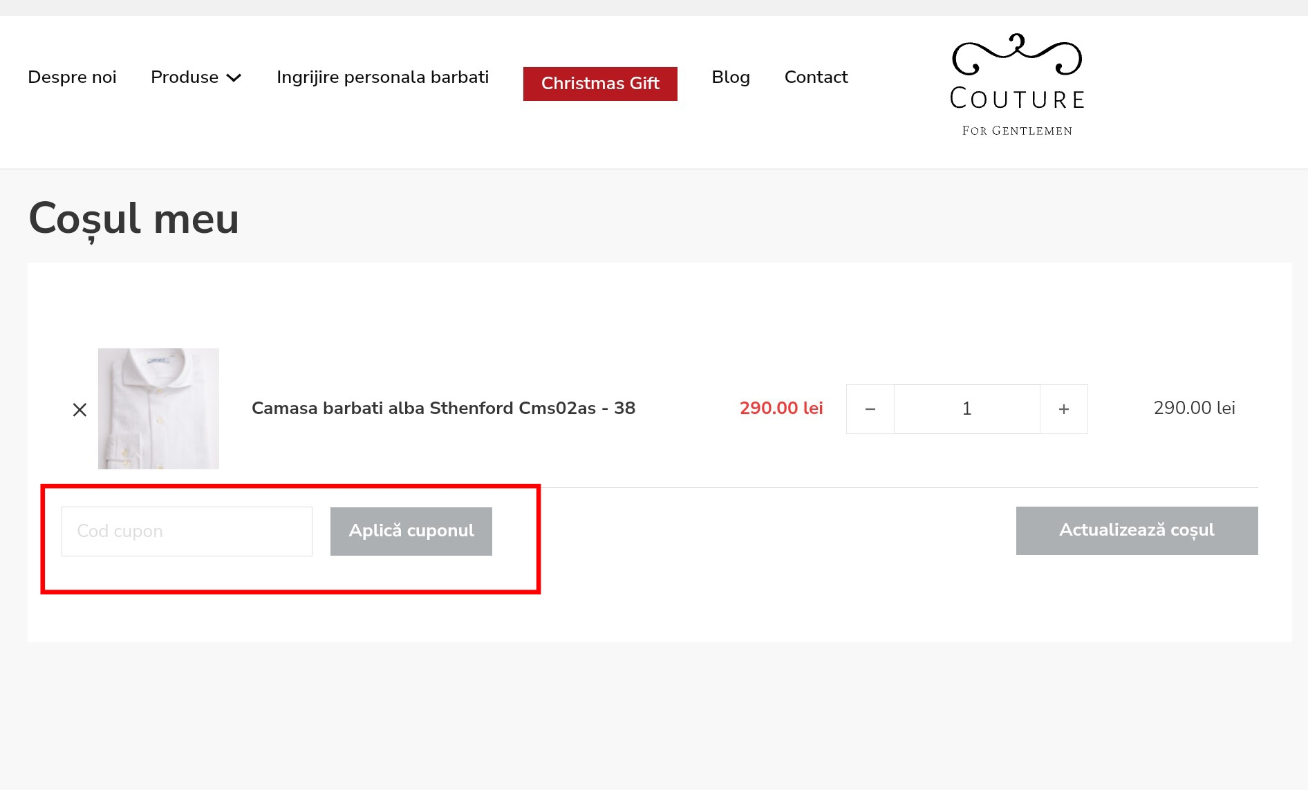 Alegeți articolele pe care doriți să le cumpărați și adăugați-le în coș. Lipiți codul de voucher în chenarul special amenajat. Apăsați pe butonul ”Aplică cuponul”.