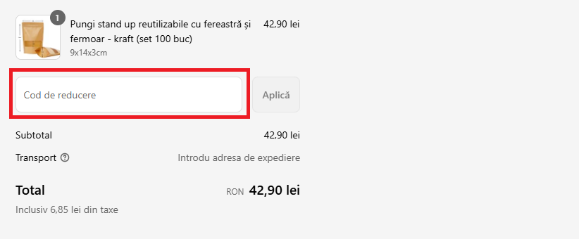 În pagina de finalizare a comenzii, găsiți câmpul dedicat pentru cuponul de reducere și introduceți codul corespunzător. Apăsați pe butonul ”Aplică”.