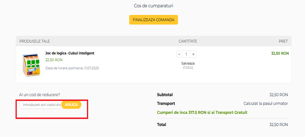 În pagina de finalizare a comenzii, găsiți câmpul dedicat pentru cuponul de reducere și introduceți codul corespunzător. Apăsați pe butonul ”Adaugă”.