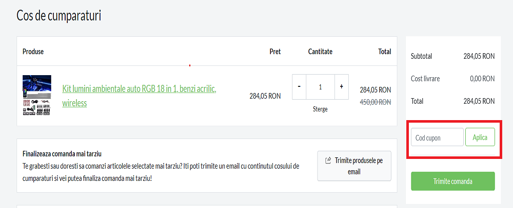 Codul de reducere se aplică în coșul de cumpărături al magazinului