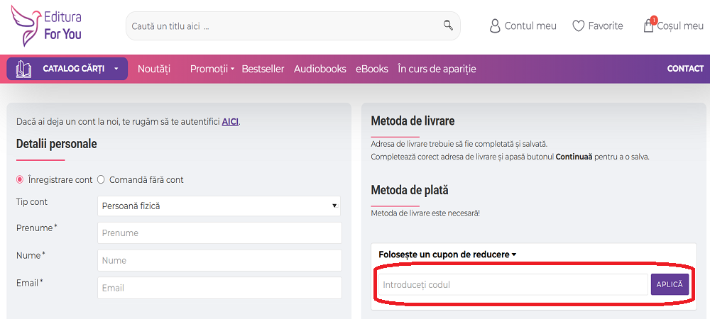 Alegeți articolele pe care doriți să le cumpărați și adăugați-le în coș. Lipiți codul de voucher în chenarul special amenajat. Apăsați pe butonul ”APLICĂ”.