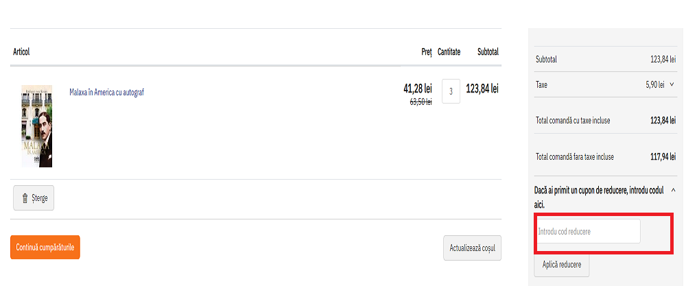 Alegeți articolele pe care doriți să le cumpărați și adăugați-le în coș. Lipiți codul de voucher în chenarul special amenajat. Apăsați pe butonul ”Aplică reducere”.