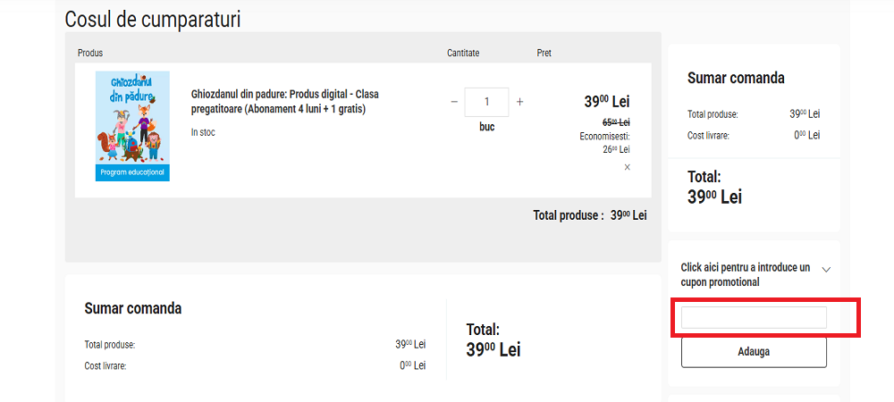 Cuponul se aplică direct în coșul de cumpărături pentru a primi instant reducerea la produsele selectate.