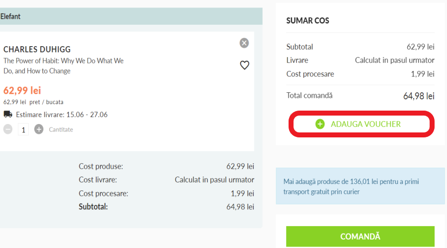 Alegeți articolele pe care doriți să le cumpărați și adăugați-le în coș. Lipiți codul de voucher în chenarul special amenajat. Apăsați pe butonul ”ADAUGA VOUCHER”.