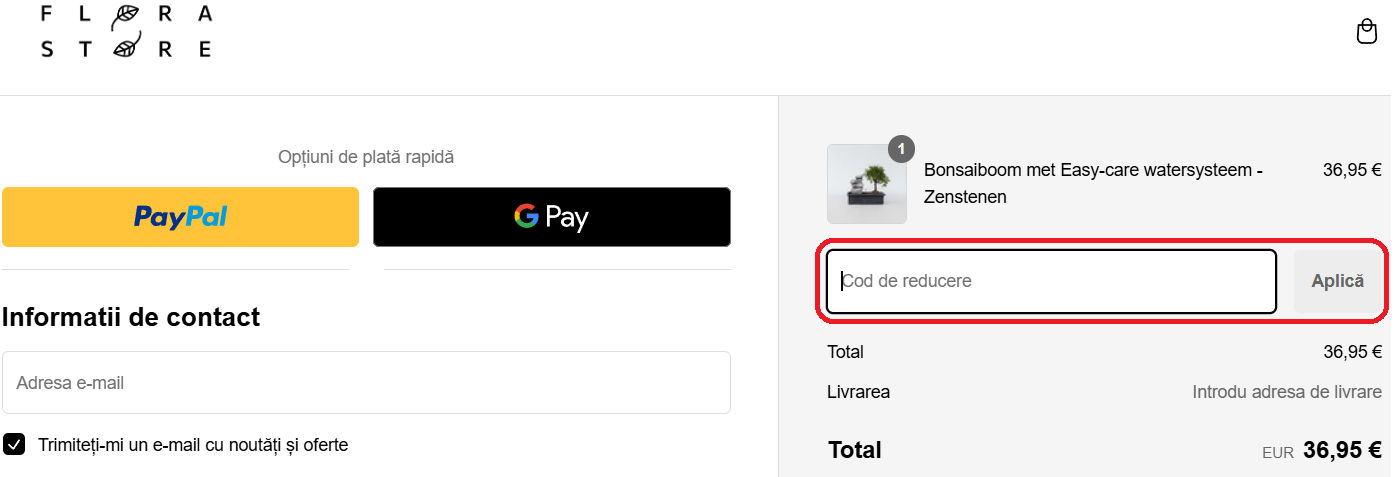Găsiți un cod reducere FloraStore pe site-ul magazinului, rețelele sociale, de la Tipli sau alți parteneri.
