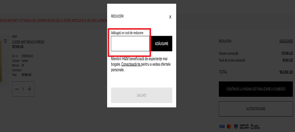 Utilizați un cod reducere H&M pentru a economisi la achiziționarea de îmbrăcăminte, încălțăminte și accesorii de la acest retailer de modă renumit. H&M România oferă o gamă variată de produse pentru femei, bărbați și copii, incluzând articole de sezon, colecții speciale și colaborări cu designeri celebri. Prin aplicarea unui cod reducere puteți beneficia de reduceri semnificative la produsele preferate. De asemenea, magazinul oferă promoții regulate și o secțiune dedicată ofertelor speciale, facilitând economii suplimentare la fiecare achiziție.