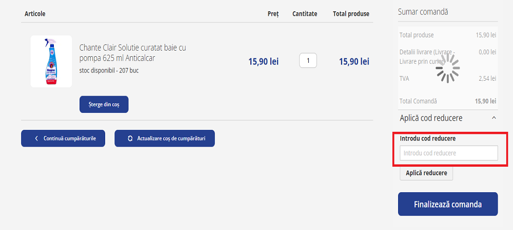 Alegeți articolele pe care doriți să le cumpărați și adăugați-le în coș. Lipiți codul de voucher în chenarul special amenajat. Apăsați pe butonul ”Aplică reducere”.