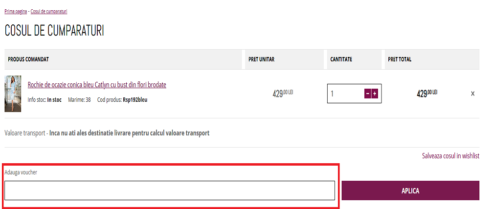 Alegeți articolele pe care doriți să le cumpărați și adăugați-le în coș. Lipiți codul de voucher în chenarul special amenajat. Apăsați pe butonul ”APLICA”.