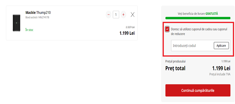 Cuponul se aplică direct în coșul de cumpărături pentru a primi instant reducerea la produsele selectate.