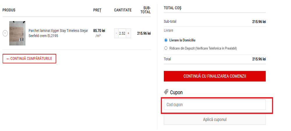 Cuponul se aplică direct în coșul de cumpărături pentru a primi instant reducerea la produsele selectate.