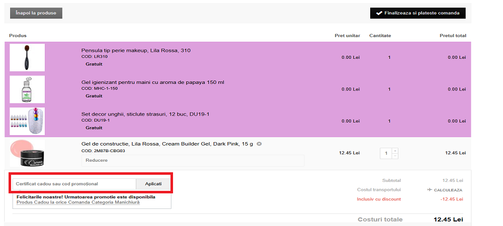 Alegeți articolele pe care doriți să le cumpărați și adăugați-le în coș. Lipiți codul de voucher în chenarul special amenajat. Apăsați pe butonul ”Aplicați”.