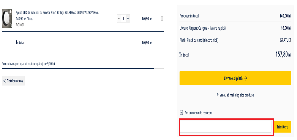 Codul de reducere se aplică în coșul de cumpărături al magazinului