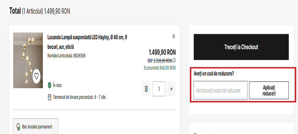 Alegeți articolele pe care doriți să le cumpărați și adăugați-le în coș. Lipiți codul de voucher în chenarul special amenajat. Apăsați pe butonul ”Aplicați reduceri”.
