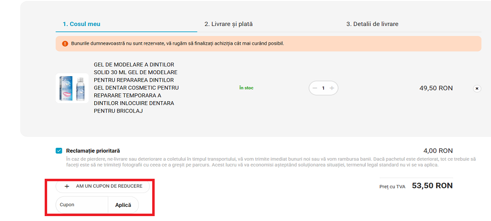 Alegeți articolele pe care doriți să le cumpărați și adăugați-le în coș. Lipiți codul de voucher în chenarul special amenajat. Apăsați pe butonul ”Aplică”.