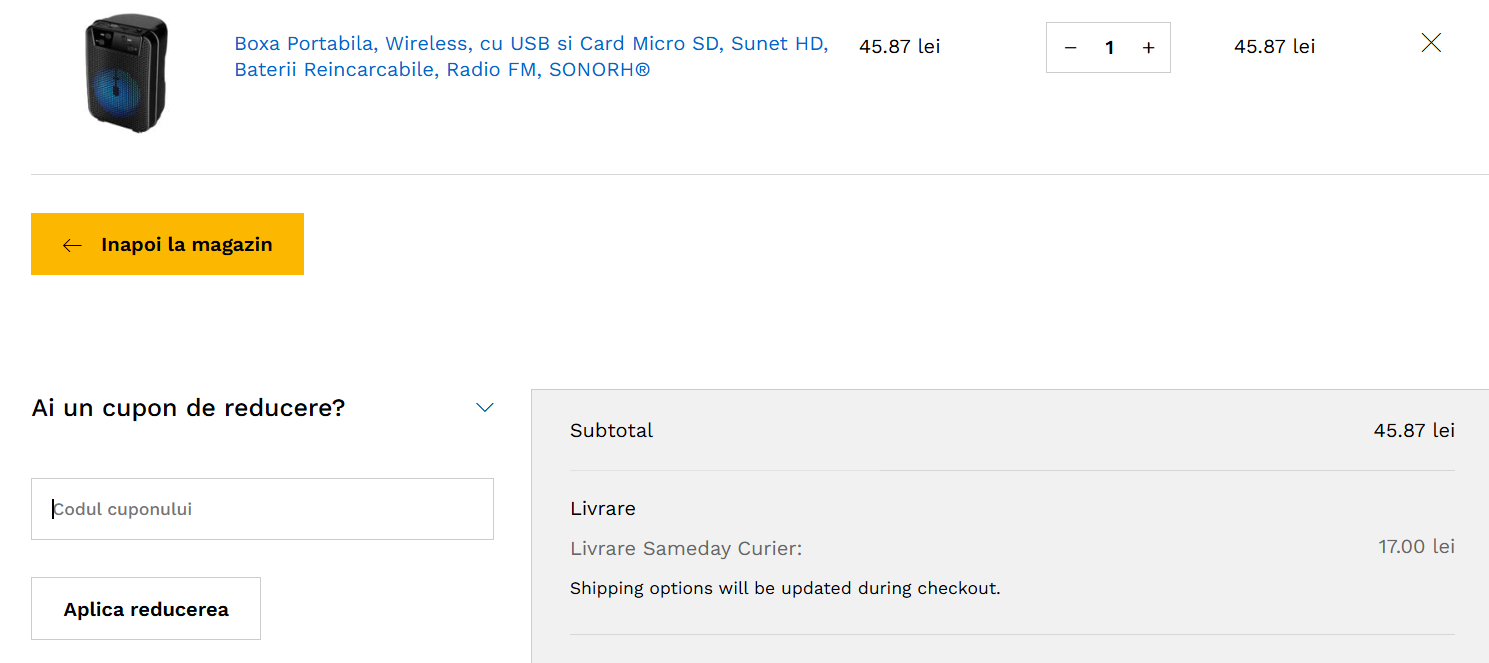 Pot exista vouchere disponibile pentru anumite categorii (de exemplu, iluminare auto), iar aplicarea lor poate reduce costul total al coșului fără efort suplimentar.
