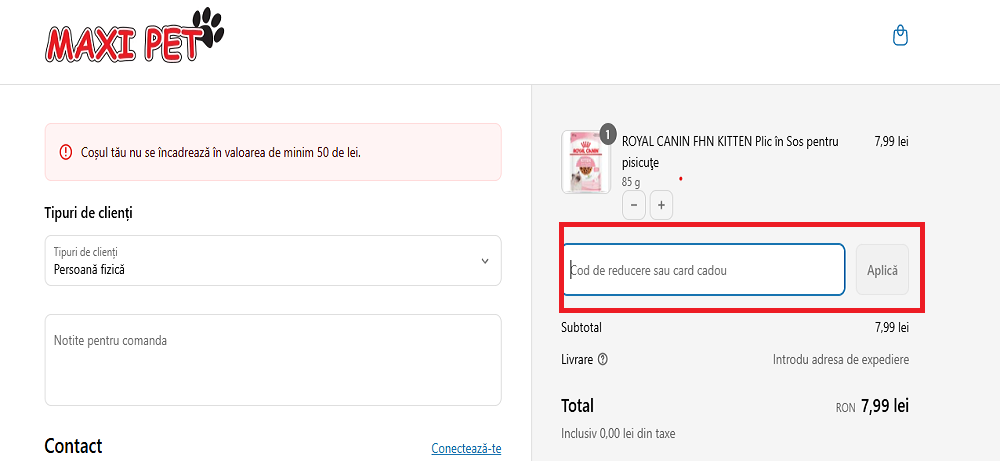 Folosiți un cod reducere Maxi Pet pentru a beneficia de reduceri semnificative la o gamă largă de produse destinate animalelor de companie, inclusiv hrană, jucării, suplimente și accesorii pentru câini, pisici, păsări și alte animale. Maxi Pet oferă atât produse premium, cât și articole la prețuri accesibile, ideal pentru îngrijirea completă a animalelor. Verificați secțiunile Promoții și Oferte speciale pentru cele mai noi reduceri și folosiți codurile de reducere pentru economii suplimentare. Înscrierea în Clubul Maxi Pet aduce avantaje suplimentare, cum ar fi puncte de loialitate pentru fiecare achiziție, pe care le puteți transforma în reduceri la următoarele comenzi. De asemenea, au o aplicație mobilă care oferă acces la promoții exclusive, gestionarea contului de fidelitate și alte facilități.