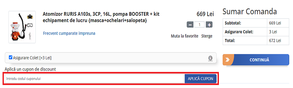 Alegeți articolele pe care doriți să le cumpărați și adăugați-le în coș. Lipiți codul de voucher în chenarul special amenajat. Apăsați pe butonul ”APLICĂ CUPON”.