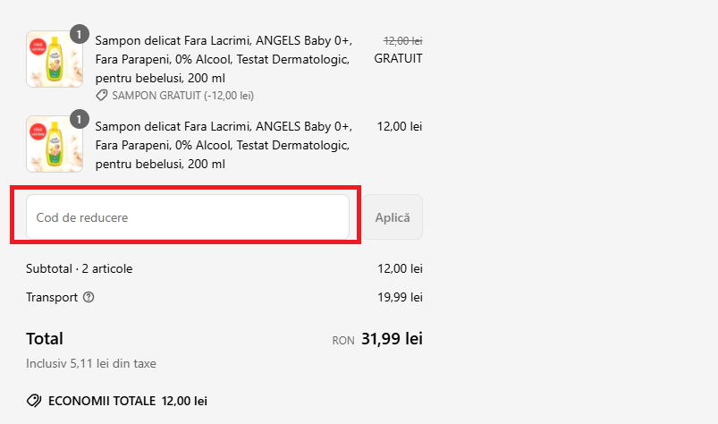 Alegeți articolele pe care doriți să le cumpărați și adăugați-le în coș. Lipiți codul de voucher în chenarul special amenajat. Apăsați pe butonul ”Aplică”.
