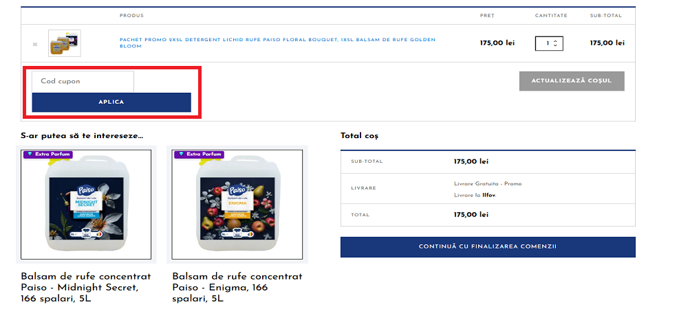 Cuponul se aplică direct în coșul de cumpărături pentru a primi instant reducerea la produsele selectate.