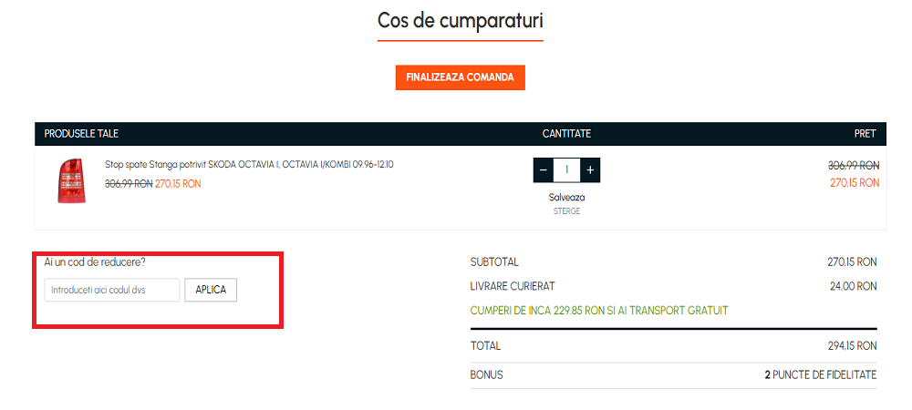 Alegeți articolele pe care doriți să le cumpărați și adăugați-le în coș. Lipiți codul de voucher în chenarul special amenajat. Apăsați pe butonul ”APLICA”.