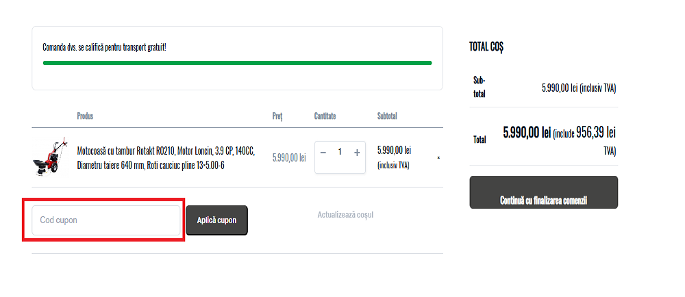 Cuponul se aplică direct în coșul de cumpărături pentru a primi instant reducerea la produsele selectate.