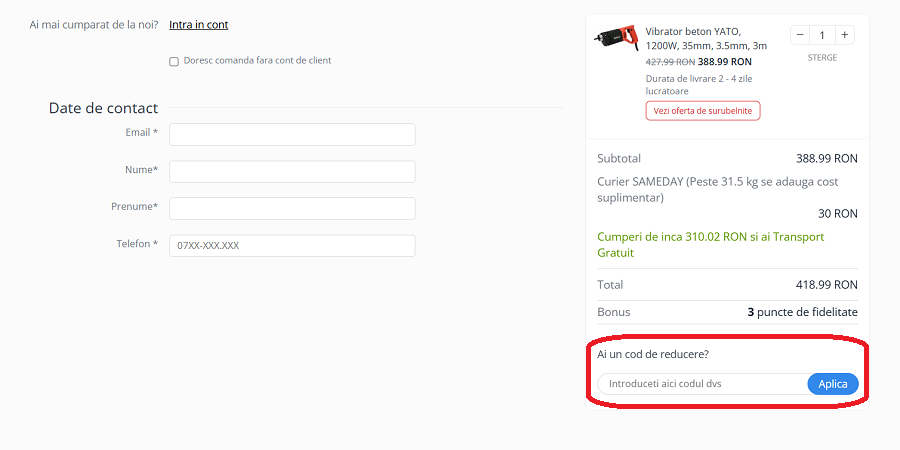 Codul de reducere se aplică în coșul de cumpărături al magazinului
