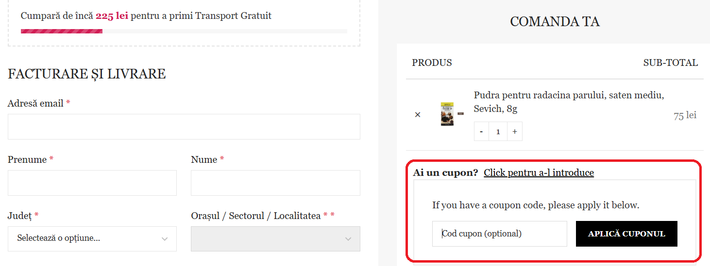 Introduceți codul de cupon în câmpul destinat codurilor promoționale. Apăsați pe butonul ”APLICĂ CUPONUL”.