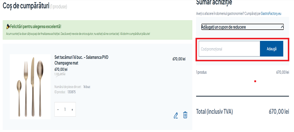 Cuponul se aplică direct în coșul de cumpărături pentru a primi instant reducerea la produsele selectate.