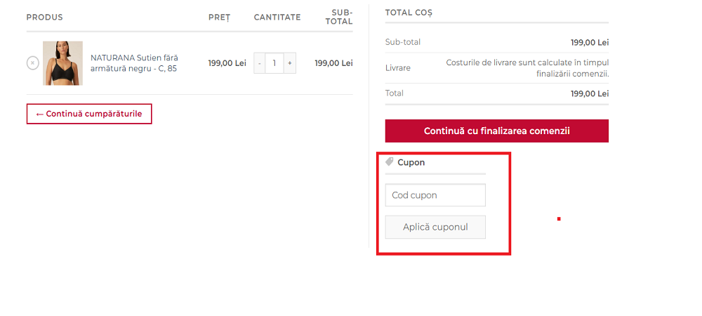 Alegeți articolele pe care doriți să le cumpărați și adăugați-le în coș. Lipiți codul de voucher în chenarul special amenajat. Apăsați pe butonul ”Aplică cuponul”.