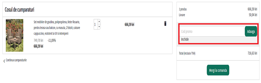 Cuponul de reducere îl puteți folosi în coșul magazinului. Valoarea minimă a comenzii 149 lei.