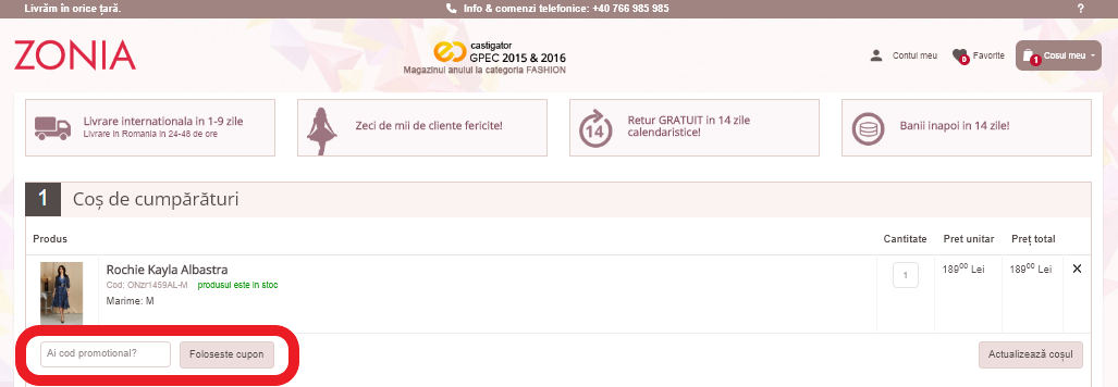 Cuponul de reducere îl puteți folosi în coșul magazinului.